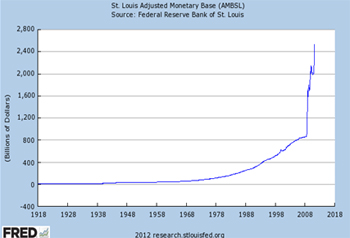 Como se aprecia claramente, el despegue de la curva, que refleja la cantidad de dinero en su forma más liquida, se produce precisamente en la década de los 70 para dispararse con Bernanke en noventa grados en 2008. El resultado ha sido una inflación desatada en los precios de commodities del mundo y una caída aun más profunda del dólar frente a otras divisas.
