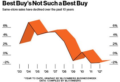 El gráfico de arriba muestra el sostenido declive de las acciones de Best Buy, el gigante del retail de tecnología. En un —muy recomendado— artículo de Business Week de esta semana el periodista Brad Stone comparte un par de reflexiones respecto de las razones de la crisis. Se pueden resumir, básicamente, en (1) cambio en el comportamiento del consumidor; y (2) lo que denomina friction.